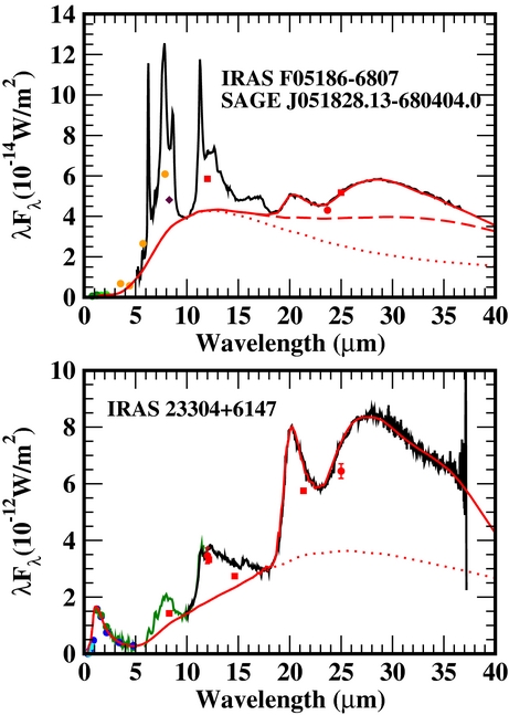 Top panel: the observations of object J051828 are shown as in Figure 1 with the model fit overplotted. The solid curve shows the overall model fit, the dashed curve shows the amorphous carbon continuum fit with the discrete shells to boost the continuum under the features, and the dotted curve shows the corresponding continuum fit with a smooth density distribution. Bottom panel: the Spitzer IRS and ISO PHT-S (below 10 μm) spectra of IRAS 23304+6147 along with the available photometry are shown with the model fit overplotted. As in the top panel, both the full model fit and the model amorphous carbon continuum from a smooth density profile are plotted to illustrate the difference between the Galactic and Magellanic Cloud models.