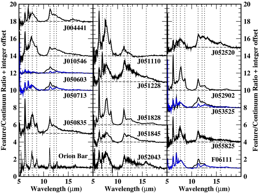 UIR feature-to-continuum ratios are plotted for the 15 objects where good model fits are available. The dotted lines mark the wavelengths of common UIR features. Where the IRS spectrum is suspected to have an SiC emission feature, the ratio curve is shown for both the amorphous carbon only continuum model (black curves) and for the best-fit model continuum with the SiC feature (blue curves). The dashed lines show the continuum levels for the different ratio spectra. For comparison a normalized UIR spectrum of the Orion Bar from the ISO SWS instrument is shown on the lower left.