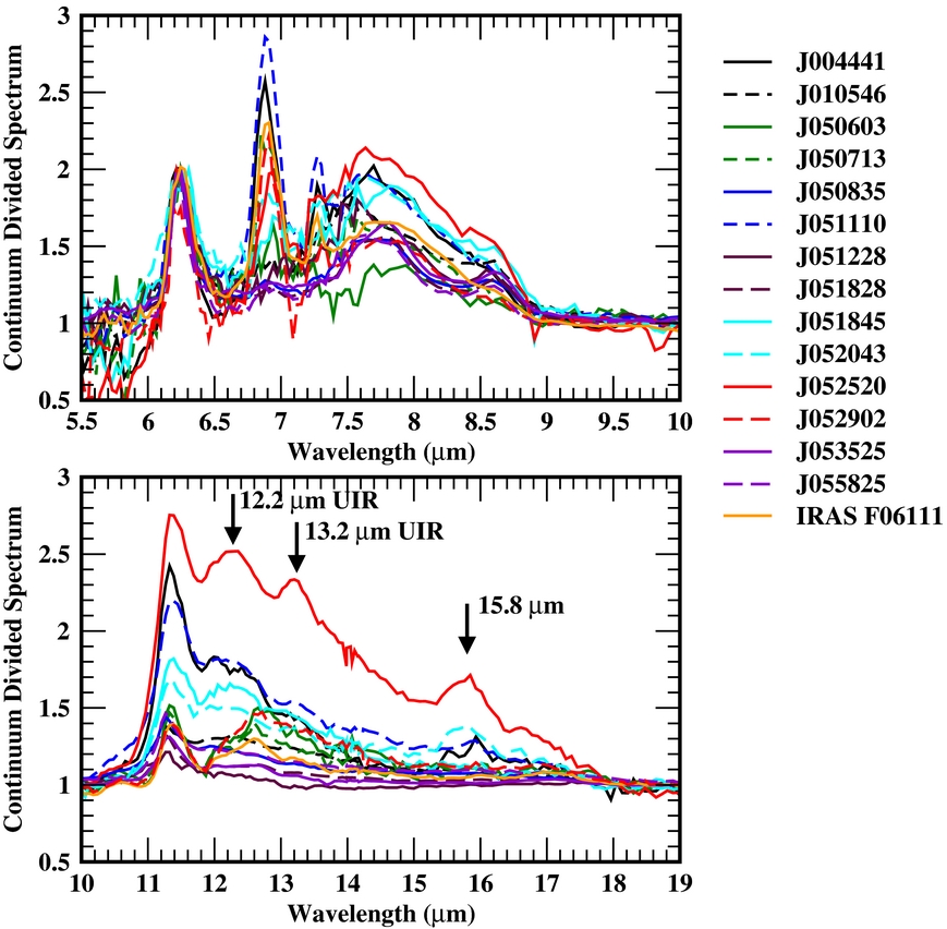 Continuum divided UIR profiles for the objects are shown normalized to a peak height of 1.0 for the 6.3 μm feature. The upper panel shows the short-wavelength region with the 6.3, 6.9, 7.7, and 8.6 μm features. The lower panel shows the 10–19 μm region, illustrating the wide range of relative strengths of the 11.2 μm feature compared to the normalized 6.3 μm features. Additional features are marked at 12.2, 13.2, and 15.8 μm.