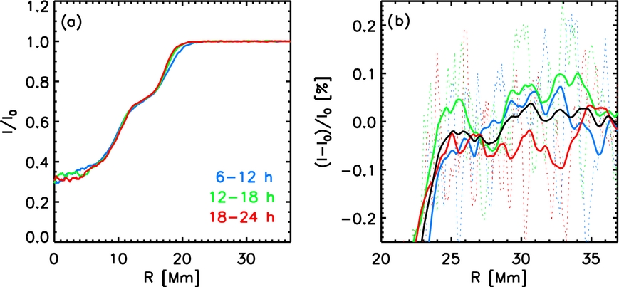 Temporal averages of the azimuthally averaged intensity for the sunspot presented in Figure 10. Panel (a) shows the intensity profile from the center of the spot to the edge of the moat region. Panel (b) presents fluctuation around the mean intensity in the moat region. Dotted lines indicate the fluctuations present in 6 hr azimuthal averages. Solid lines are in addition averaged with a 2.5 Mm window in the radial direction to highlight potential trends of intensity with radius. The black line shows the average from 6 to 24 hr.