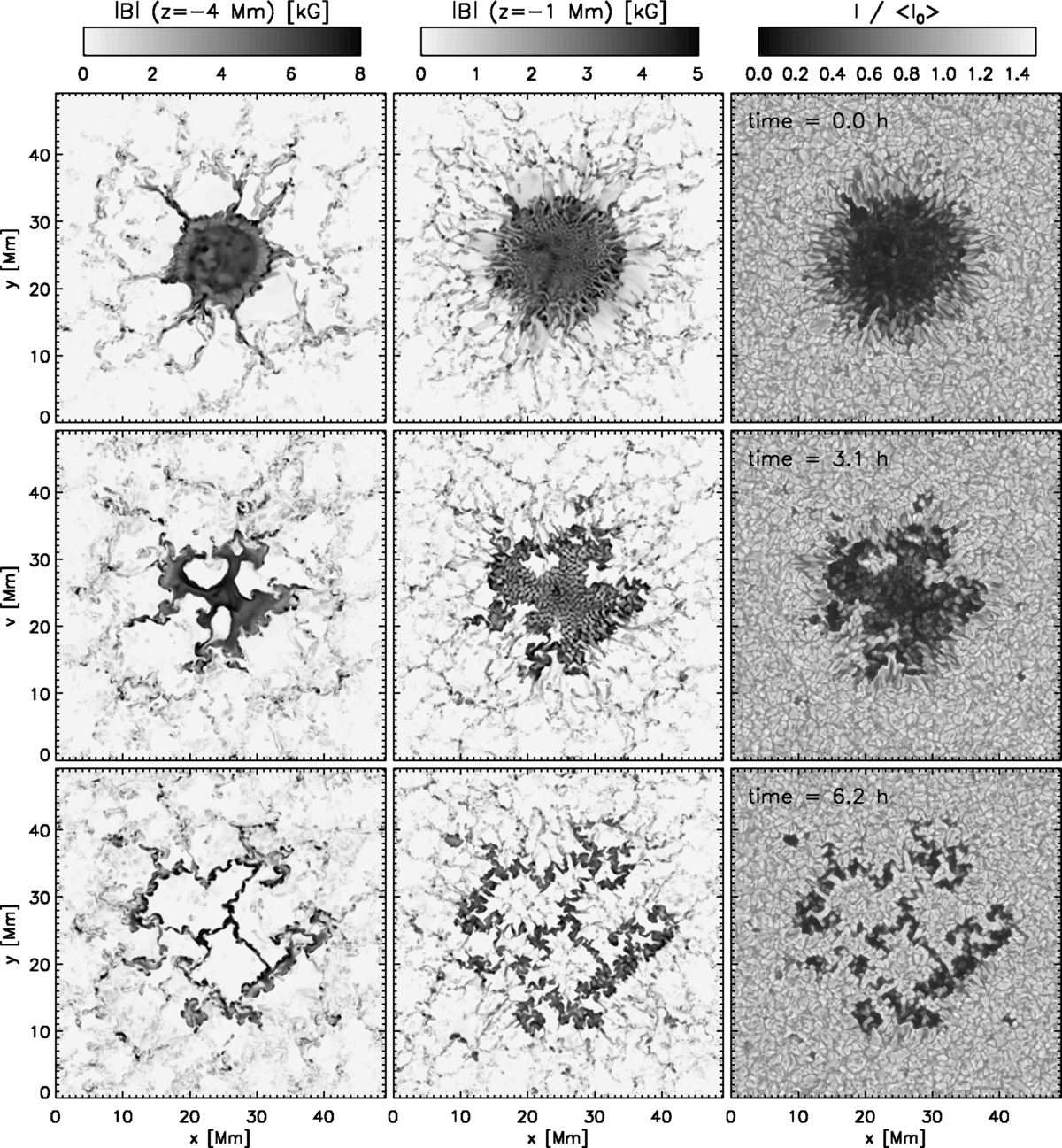 Temporal evolution of a sunspot in a 6.144 Mm deep domain. The bottom boundary is symmetric in all three mass flux components. The sunspot is decaying on a timescale of about 3–6 hr due to interchange instabilities developing near the bottom of the domain. The field-free plasma intruding near the bottom boundary leads to buoyant upflows that develop islands of granulation within the umbra of the spot. After about 6 hr most of the magnetic field is dispersed into a structure the size of a few pores.