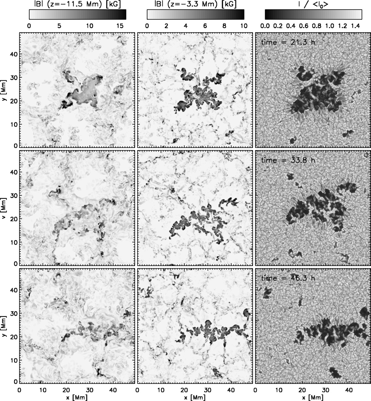 Temporal evolution of a sunspot in a 16.384 Mm deep domain using an open bottom boundary condition (symmetric in all three mass flux components). The simulation was restarted from the snapshot at t = 8.8 hr shown in Figure 1; the elapsed time is relative to t = 0 hr to be comparable to Figure 1. The open boundary condition leads to a stronger deformation and fragmentation, compared to the reference run shown in Figure 1, but even at t = 46.3 hr the larger fraction of the flux remains concentrated within the main sunspot (see Figure 14). Compared to the 6 Mm deep domain presented in Figure 12, dynamical timescales near the bottom are about 6–8 times longer.