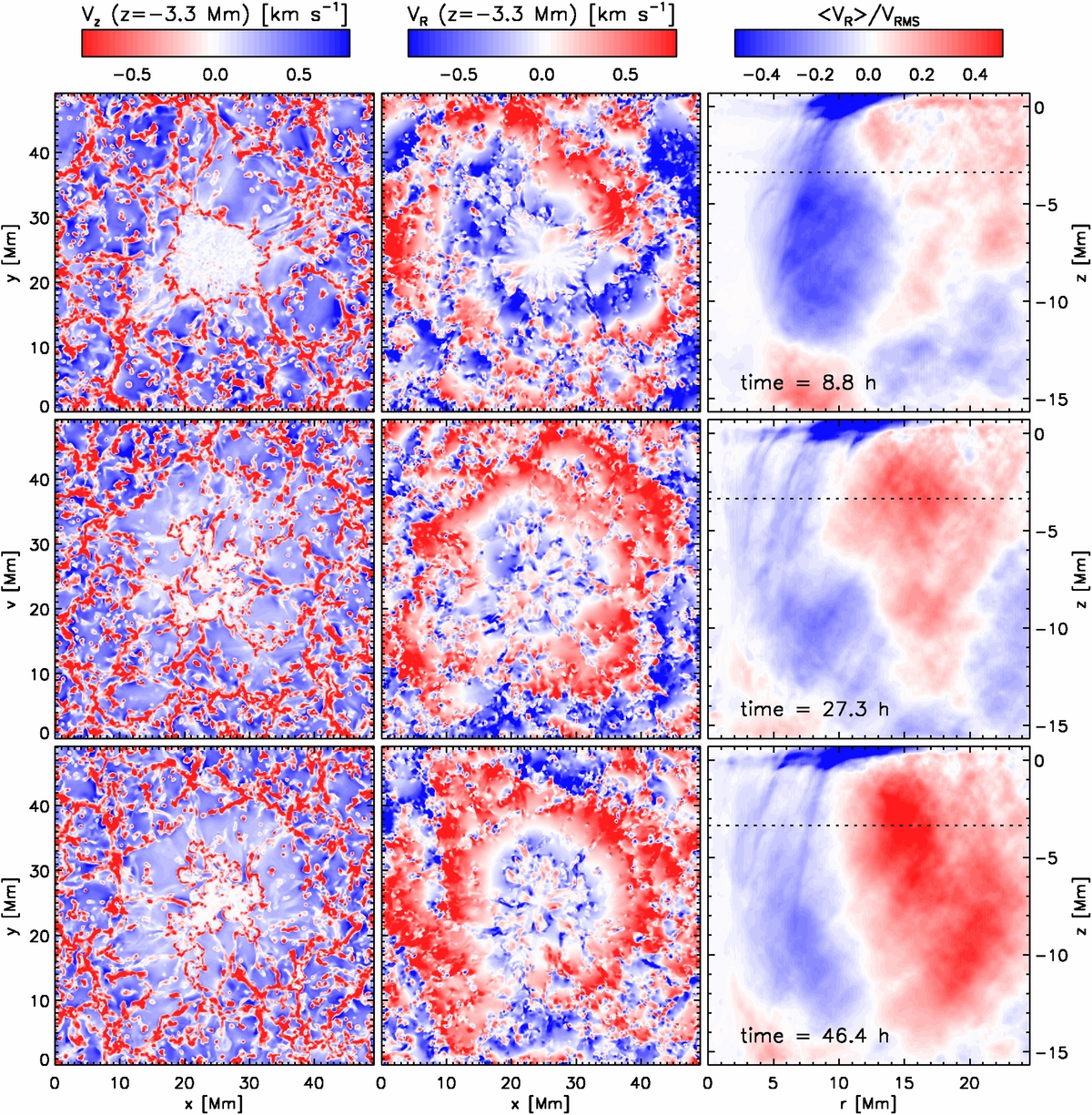 Evolution of large-scale flows shown for the same snapshots presented in Figure 1. The left column presents vertical velocity at a depth of z = −3.3 Mm; blue colors indicate upflows. The middle column presents radial flow velocity at a depth of z = −3.3 Mm; red colors indicate outflows. The right column presents azimuthal averages of the radial flow velocity, normalized by the convective rms velocity. The dotted horizontal line indicates the depth level of z = −3.3 Mm used in the left and middle columns. Convection cells arrange in a ring-like fashion around the sunspot. As a consequence, horizontal convective flows lead to a mean flow reaching about 50% of the convective rms velocity during the later stages of the simulation.