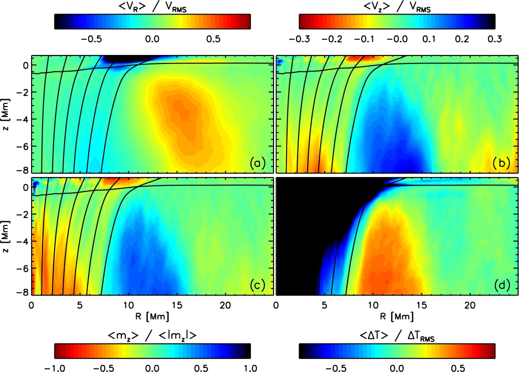 Properties of the azimuthally and temporally (15 hr from t = 35 hr to t = 50 hr) averaged flow in the simulation run without penumbra. Displayed are (a) radial and (b) vertical flow velocities relative to the convective rms velocity (positive values indicate outflow/upflow). Panel (c) presents the fraction of the mass flux present in the azimuthal mean component. Panel (d) presents the temperature perturbation relative to the mean stratification computed outside R = 25 Mm (i.e., corners of the domain) in units of the rms fluctuation (outside R = 25 Mm). It is evident that the main upflow coincides with an annulus of enhanced temperature between R = 8 and R = 16 Mm. The thermal signature of the large flow is comparable to that of convective flows. We indicated the field lines of the azimuthally averaged magnetic field for reference; the nearly horizontal line near the top indicates the τ = 0.1 level.