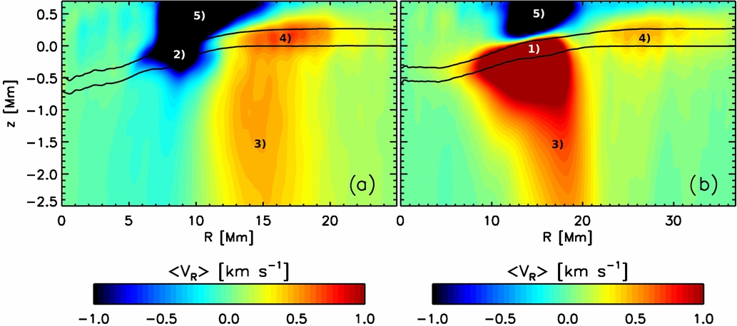 Comparison of the radial flow amplitudes in the uppermost 3 Mm of the domain. Panel (a) corresponds to the simulation presented in Figure 4, panel (b) to Figure 5. In contrast to Figures 4 and 5 the velocity is not normalized by the rms velocity. Also note the different horizontal scales and resulting aspect ratio in both panels. The two dark lines indicate the τ = 1 and τ = 0.01 levels in both panels. In both cases the flow amplitudes of the outflows surrounding the sunspots peak above τ = 1, typical flow velocities are about 600 m s −1 for the case without penumbra and 400 m s −1 for the case with penumbra. The numbers indicate flow components that are discussed further in the text.