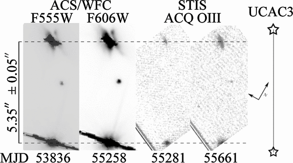 Position of PDS 144 N (top) with respect to PDS 144 S (bottom) over a 5 year baseline is seen in these HST images, and they show no change in separation. The schematic labeled UCAC3 shows the predicted location of the stars in our fourth epoch (MJD 55661) if we were to apply the UCAC3 proper motions to the two PDS 144 stars in our first epoch (MJD 53836).