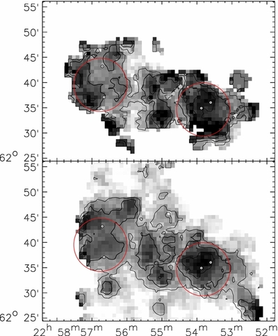 Top: disk fraction map created with the X-ray-selected members. Contours represent disk fractions of 20%, 34%, and 50%. Red circles outline the sub-clusters and the white dots are the locations of the massive stars. Bottom: disk fraction map created with the visible-selected members. Contours are at the same levels as above.
