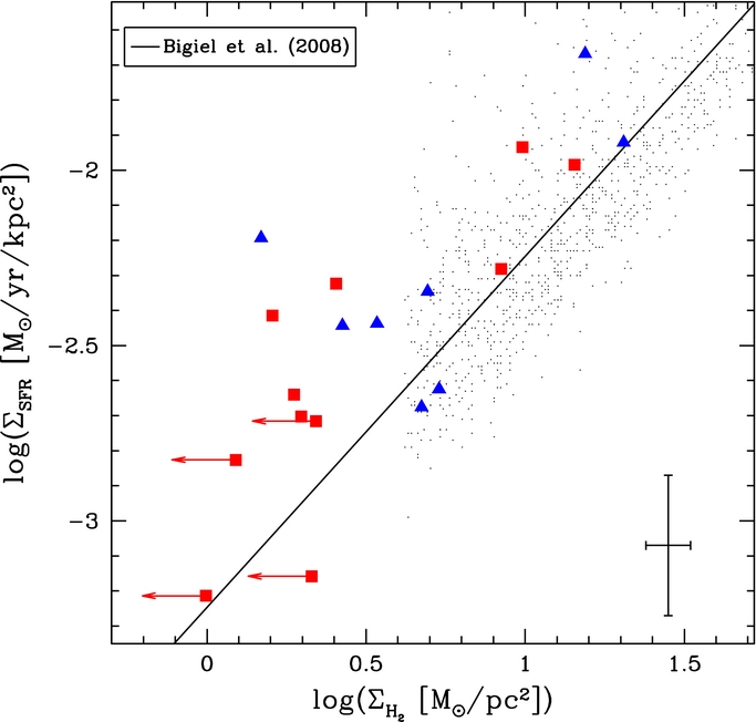 3. The solid line shows the Bigiel et al. (2008) fit to the molecular hydrogen star formation law: