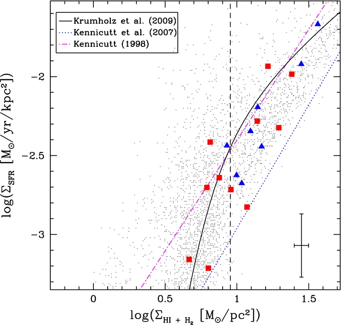 SFR surface density vs. total hydrogen surface density. Symbols are as in Figure 3. The magenta dot-dashed line shows the Kennicutt (1998) fit to a sample of 61 normal spirals and 36 starburst galaxies, where the measurements are averages over the optical disk. The dotted line shows the Kennicutt et al. (2007) fit to M51 data at 520 pc resolution. The solid black line shows the Krumholz et al. (2009) model at 0.4 Z ☉ metallicity.