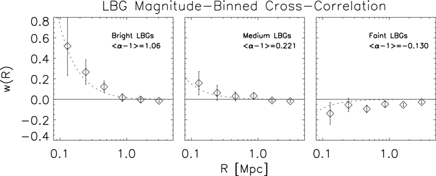 z > 26. These magnitude ranges are selected to contain LBGs for which (α − 1) > 0, ≈0, and <0. The measured correlations for