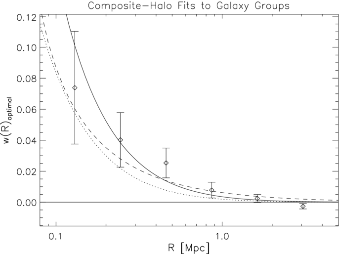 Composite-halo fits to the optimally weighted correlation function, using the LBG background source sample. The significance of the magnification detection is 4.9σ. The dashed line is the composite-SIS and the solid line is the composite-NFW. We find the best-fit relative scaling relations for each to be a = M mag/ M shear = 1.2 ± 0.4 ± 0.4 sys (SIS) and a = 1.8 ± 0.5 ± 0.4 sys (NFW). The dotted line shows the prediction from the shear measured values of M 200 (A. Leauthaud 2011, private communication).