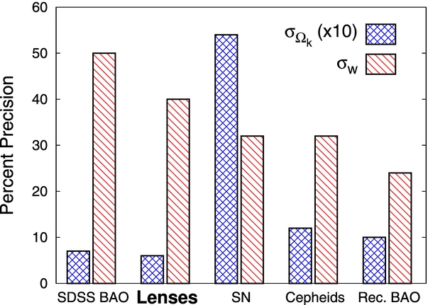 Precision of cosmological constraints on Ω k and w for five probes each in combination with WMAP in an o wCDM cosmology: SDSS BAO (Percival et al. 2010), the two time-delay lenses RXJ1131−1231 and B1608+656 (this work), SN (Suzuki et al. 2012), Cepheids (Riess et al. 2011), and reconstructed BAO (Mehta et al. 2012). Precision for Ω k and w is defined as half the 68% CI as a percentage of 1 and −1, respectively.
