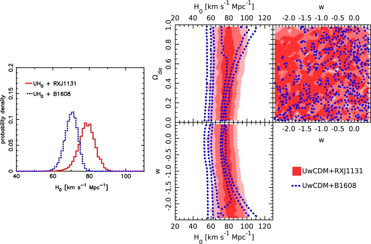Comparison of RXJ1131−1231 (solid red) with B1608+656 (dotted blue) in U H 0 (left) and U wCDM (right) cosmologies. The two distributions overlap within 2σ. The cosmological constraints from the two lenses are statistically consistent with each other: the ratio of the probability that the two lenses share global cosmological parameters to the probability that the lenses require independent cosmologies is 3.2 in U H 0 and 3.8 in U wCDM.