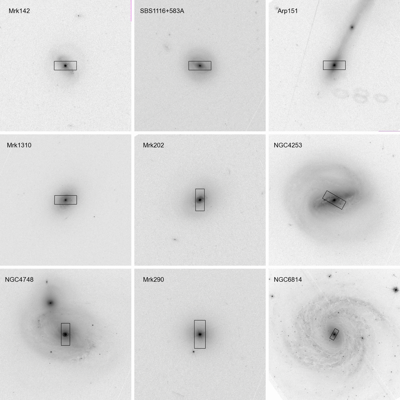 HST WFC3 F547M images of the AGN host galaxies, displayed with an inverted logarithmic stretch. The black rectangles show the geometry and orientation of each ground-based spectroscopic monitoring aperture. The size of the region displayed is 1′ × 1′, except for NGC 6814 which is displayed in a 2′ × 2′ box. For all images, north is up and east is to the left.
