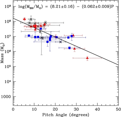 Black hole mass vs. pitch angle for all spiral galaxies with directly measured black hole masses available. The best linear fit to this data is illustrated and gives the following relation log ( M BH/ M ☉) = (8.21 ± 0.16) − (0.062 ± 0.009) P. The fit has a reduced χ 2 = 4.68 with a scatter of 0.38 dex. Black hole masses measured using stellar and gas dynamics techniques are labeled with black ×'s (10 points), reverberation mapping masses with red triangles (12 points), and maser measurements with blue squares (12 points).