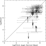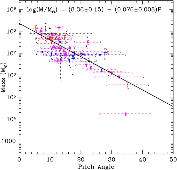 SMBH mass–pitch angle relation for all available directly measured black hole masses (as in Figure 1) and for those masses estimated indirectly via σ in our preferred sample (see Table 1 and Section 2.1 for details). The fit to the SMBH mass–pitch angle relation for this extended data set is log ( M BH/ M ☉) = (8.36 ± 0.15) − (0.076 ± 0.008) P with a χ 2 = 10.43 and a scatter of 0.45 dex. This fit is consistent with that obtained from our sample of directly measured black hole masses (Figure 1) and is almost identical to the fit given in Seigar et al. (2008). The addition of σ-derived masses, several of which are at the low-mass end of our distribution, tends to confirm the validity of the complete sample fit shown in Figure 1 against the much shallower fit found for the maser-modeling-only data shown in Figure 2. Black ×'s represent data from stellar or gas dynamics (10 points), blue squares represent data from maser modeling (12 points), red triangles come from reverberation mapping data (12 points), and magenta octagons represent masses derived from the M–σ relation (20 points).