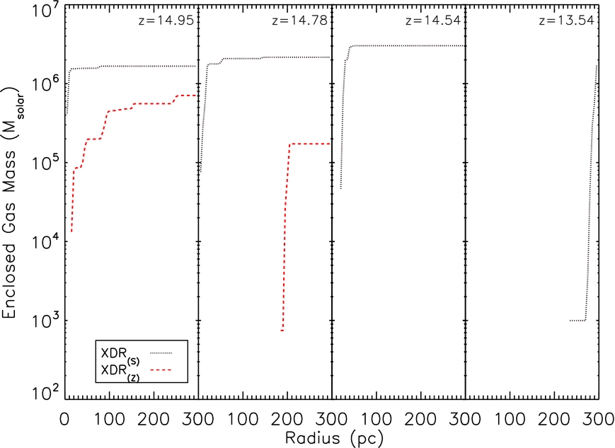 Enclosed gas mass with T ⩾500 K and ρ > 10 −20 g cm −3 for both the XDR S run (black dotted line) and the XDR Z run (red dashed line), at z = 14.95, 14.78, 14.54, and 13.54 from left to right, as a function of radius.