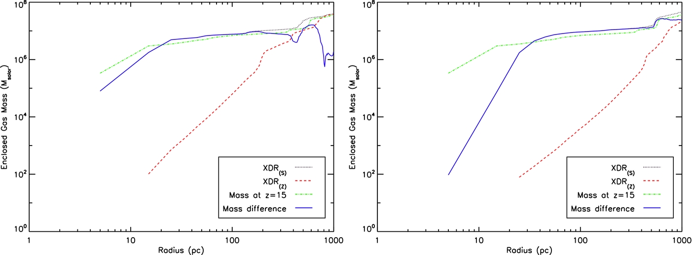 Enclosed gas mass of the XDR S run (black dotted line), the XDR Z run (red dashed line), and the gas mass difference between the two runs (blue dot-dashed line) at z = 14.78 (left) and z = 14.54 (right) as a function of radius. The green dot-dashed line is the enclosed gas mass of the halo at z = 15.