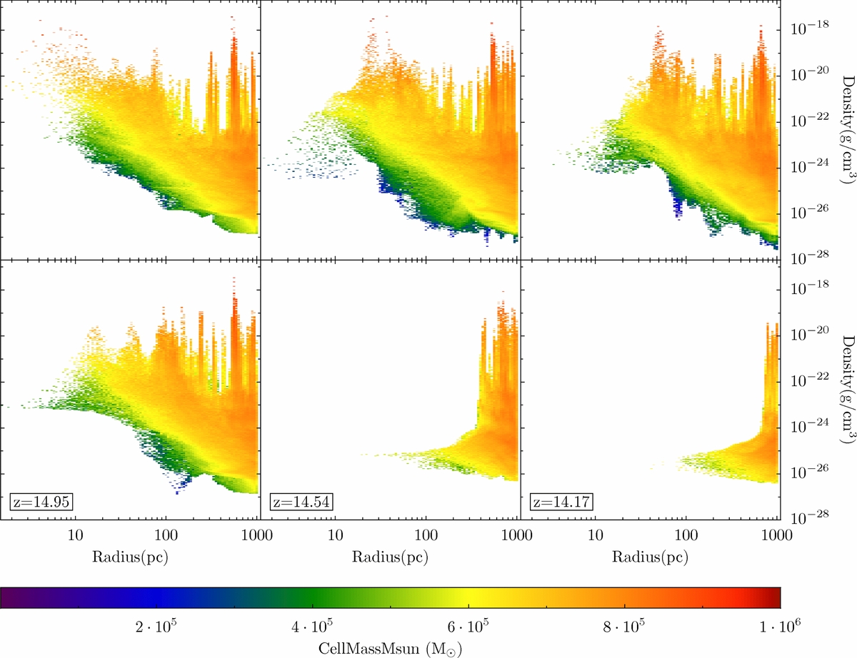 2D profiles of density vs. radius for the XDR S (top) and XDR Z (bottom) at z = 14.95 (left), z = 14.54 (middle), and z = 14.17 (right).