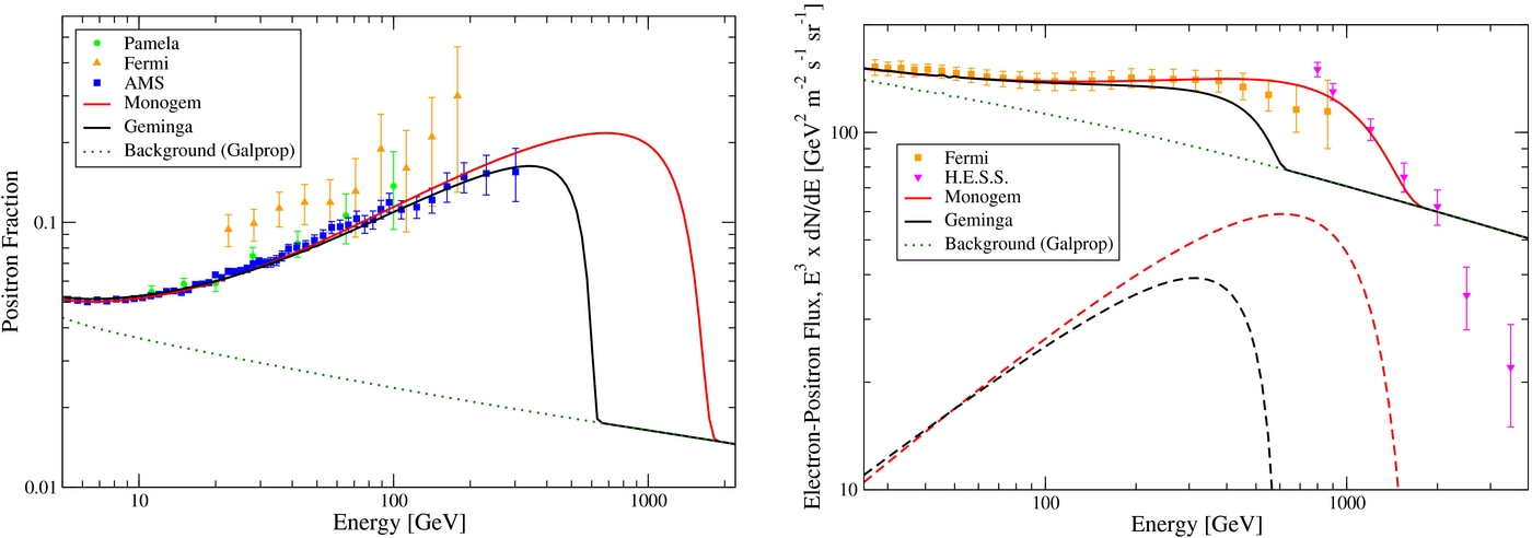 Left: the positron fraction from a combination of the Galprop model for the diffuse e ± Galactic background (green dotted), along with contributions from the Geminga (black) and Monogem (red) pulsars, compared with data from PAMELA (green circles), Fermi-LAT (orange triangles) and AMS-02 (blue squares). Right: the flux of cosmic-ray electrons and positrons from a combination of the same Galprop model (green dotted), with contributions from the Geminga (black dashed) and Monogem (red dashed) pulsars. These create a total cosmic-ray lepton spectrum (black and red solid respectively), which can be compared with data from the Fermi-LAT (orange squares) and H.E.S.S. (pink diamond) observations, (right). Note that the diffuse background from Galprop was not tuned to reproduced the H.E.S.S. data, and we do not attempt to fit those data above 1 TeV.
