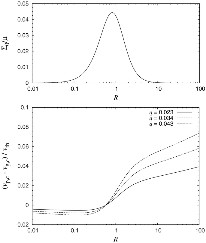Top: density profile of ring-shaped disks. Bottom: relative circular velocity of particles with respect to gas, normalized to the mean thermal speed of gas molecules. The values of q have been extracted from Table 1.