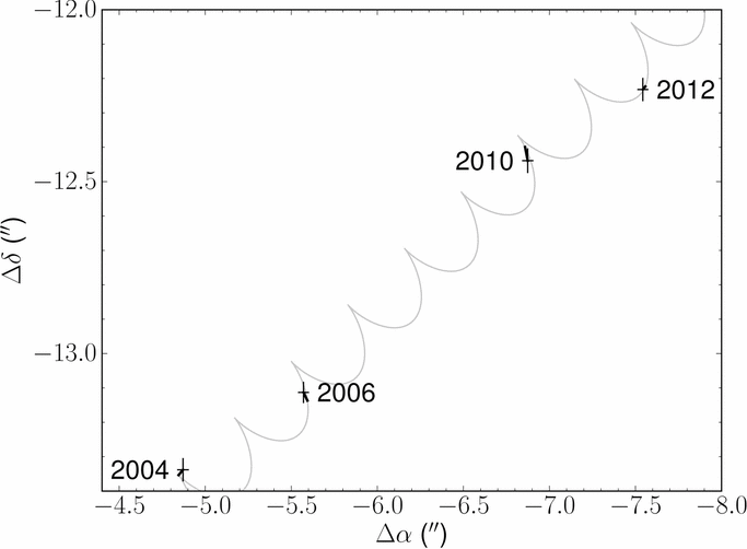 Test of astrometry on a background star in the reference frame of Fomalhaut A. For the 2010 and 2012 epochs of STIS data, the error bars are derived assuming 17 mas in residual geometric distortion instead of the 66 mas from the STIS calibration program (Table 2).