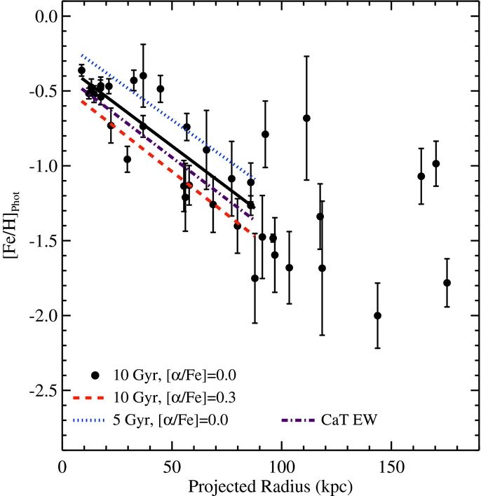 Median photometric metallicity of all M31 stars in each field, along with the linear fit to the median field values (solid line), calculated using the nominal 10 Gyr, [α/Fe] =0.0 VandenBerg et al. (2006) isochrones. Error bars show the error in the median value of each field. The dashed and dotted lines show the linear least-squares fits to the median metallicity estimates in each field calculated using alternative methods: 10 Gyr, [α/Fe] =0.3 isochrones (red dashed line), 5 Gyr, [α/Fe] =0.0 isochrones (blue dotted line), and spectroscopic metallicity estimates based on the Ca II triplet EW (purple dot-dashed line).