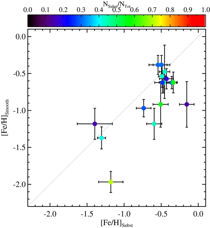 Same as Figure 13, with points color-coded by the fraction of stars in the field that are estimated to belong to the kinematical substructure. The difference in metallicity between the two populations is generally largest when the tidal debris dominates the stellar population in the field.