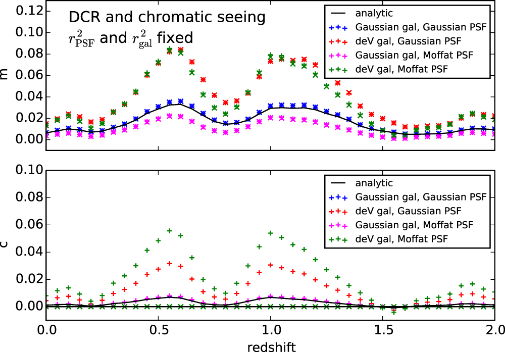 Shear calibration parameters m and c due to both differential chromatic refraction and chromatic seeing. Details are the same as described in the caption for Figure 8. However, here the analytic prediction depends on both the galaxy and PSF second-moment squared radii, and is otherwise independent of the profiles of the PSF and galaxy.