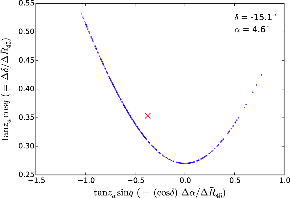 2D distribution of ﹩\mathrm{tan}{z}_{a}\mathrm{sin}q=(\mathrm{cos}\delta ){\rm{\Delta }}\alpha /{\rm{\Delta }}{\bar{R}}_{45}﹩ and ﹩\mathrm{tan}{z}_{a}\mathrm{cos}q={\rm{\Delta }}\delta /{\rm{\Delta }}{\bar{R}}_{45}﹩ for one particular field in the LSST Operations Simulation Run 3.61 (Delgado et al. 2006). The distribution follows a curve due to geometric constraints. The centroid of the distribution is indicated by the red “×.”