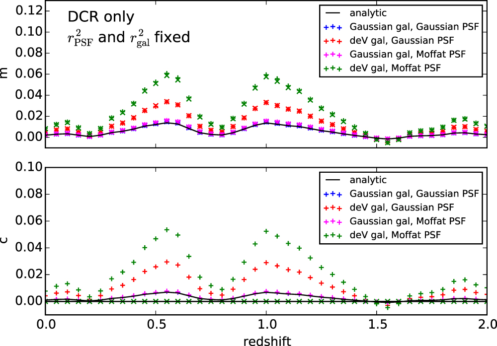 Shear calibration parameters due to differential chromatic refraction as a function of galaxy redshift, predicted analytically (solid black curve) and with a ring-test (colored symbols). Chromatic seeing is not implemented here. The filter is the LSST r-band, and the zenith angle is 45°. The predictions are based on a G5V stellar SED and an Sa galactic SED. The galaxy has intrinsic ellipticity ﹩| {{\boldsymbol{\epsilon }}}^{(i)}| =0.3﹩ and second-moment squared radius ﹩{r}_{\mathrm{gal}}^{2}={(0.3\mathrm{arcsec})}^{2}﹩. The PSF has second-moment squared radius ﹩{r}_{\mathrm{PSF}}^{2}={(0.42\mathrm{arcsec})}^{2}﹩ measured at the filter effective wavelength. The analytic prediction (solid curves) depends on the galaxy second-moment squared radius, but is otherwise independent of the profiles of the PSF and galaxy. +'s indicate the components of m and c oriented along and perpendicular to the zenith direction, and ×’s indicate the components oriented 45° to the zenith direction. The different colored plotting symbols indicate different assumed profiles for the galaxy and for the fixed-wavelength PSF, with r2 fixed for both the galaxy and the PSF in all cases. The blue symbols lie directly under the magenta symbols (and are therefore not visible) since the ring-test predictions do not depend on the PSF profile when ﹩{r}_{\mathrm{PSF}}^{2}﹩ is fixed.