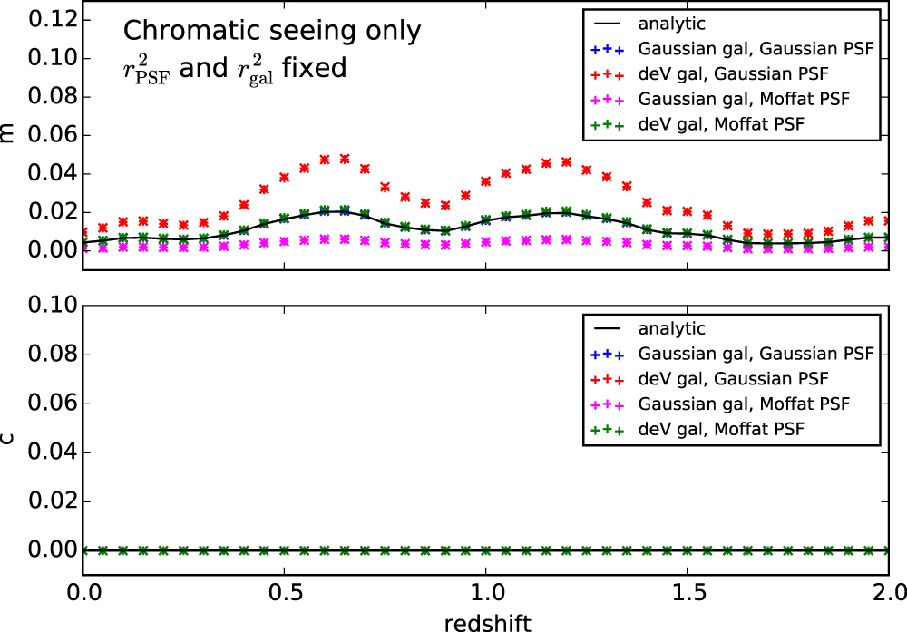 Shear calibration parameters due to chromatic seeing with no DCR. Details are the same as described in the caption for Figure 8. However, here the analytic prediction depends on both the galaxy and PSF second-moment squared radii, and is otherwise independent of the profiles of the PSF and galaxy.
