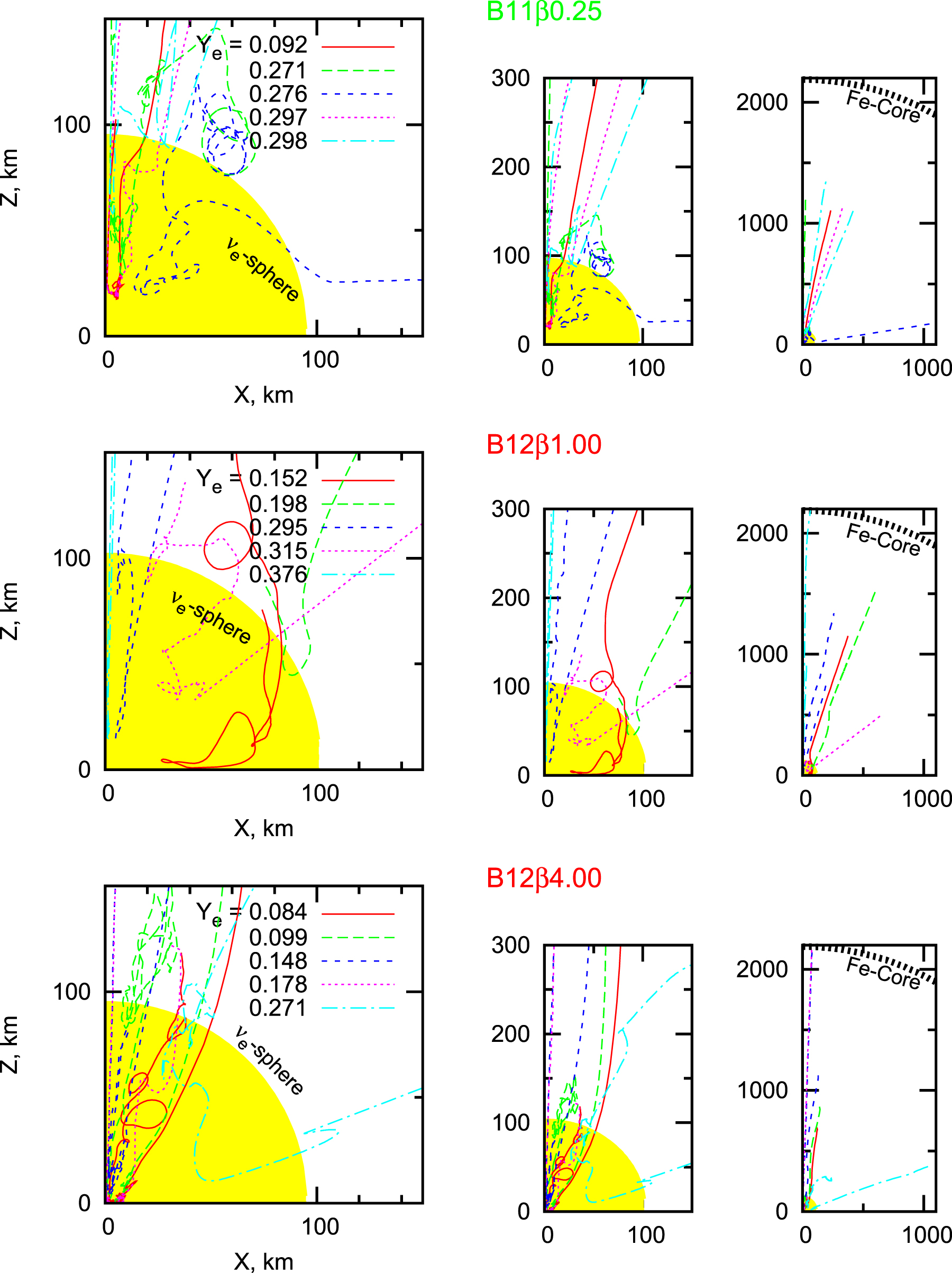 Track for ejected tracer particles and the path of tracer particles for a delayed-jet model. B11 ﹩\beta ﹩ 0.25 (upper) and two prompt models, B12 ﹩\beta ﹩ 1.00 (medium) and B12 ﹩\beta ﹩ 4.00 (lower), are illustrated in different spacial scales. Each particle is labeled by ﹩{Y}_{{\rm{e}}}﹩ at the end of NSE. The central filled (yellow) circular area describes the neutrino-sphere.