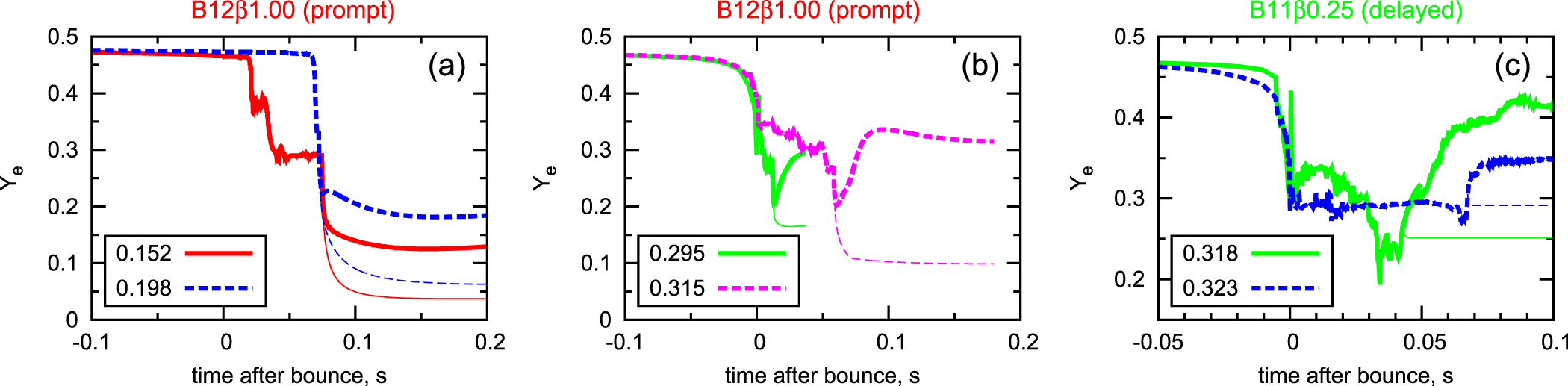 Time evolution of the ﹩{Y}_{{\rm{e}}}﹩ for the selected tracer particles from B12 ﹩\beta ﹩ 1.00 (prompt-jet) and B11 ﹩\beta ﹩ 0.25 (delayed-jet). Each line begins at the onset of collapse, of which time is measured from the core-bounce. Thick lines are results taking into account all weak reactions between the nucleons and neutrinos, whereas thin lines are results ignoring neutrino absorptions.