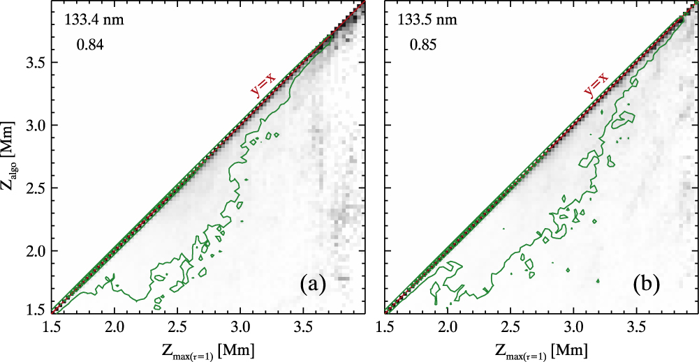 Probability distribution function (PDF) of ﹩\tau =1﹩ height at the line center determined by the line center finding algorithm as a function of the theoretical line core ﹩\tau =1﹩ height (the maximum ﹩\tau =1﹩ height over the line profile) for the C II 133.4 nm line (a) and the C II 133.5 nm line (b). Each column in the panels is scaled to maximum contrast to increase visibility. The inner green contour encompasses 50% and the outer contour encompasses 90% of all points. The red line denotes y = x. The Pearson correlation coefficient is given in the upper left corner.