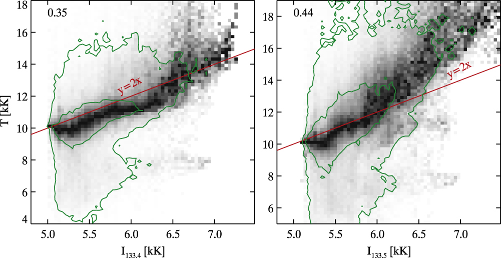 PDF of the temperature at the formation height as a function of the radiation temperature of the intensity at the line core for the C II 133.4 nm line (left panel) and the C II 133.5 nm line (right panel). Each column in the panels is scaled to maximum contrast to increase visibility. The green contours encompass 50% and 90% of all points. The Pearson correlation coefficient is given in the upper left corner of both panels. The red line denotes the line y = 2x.
