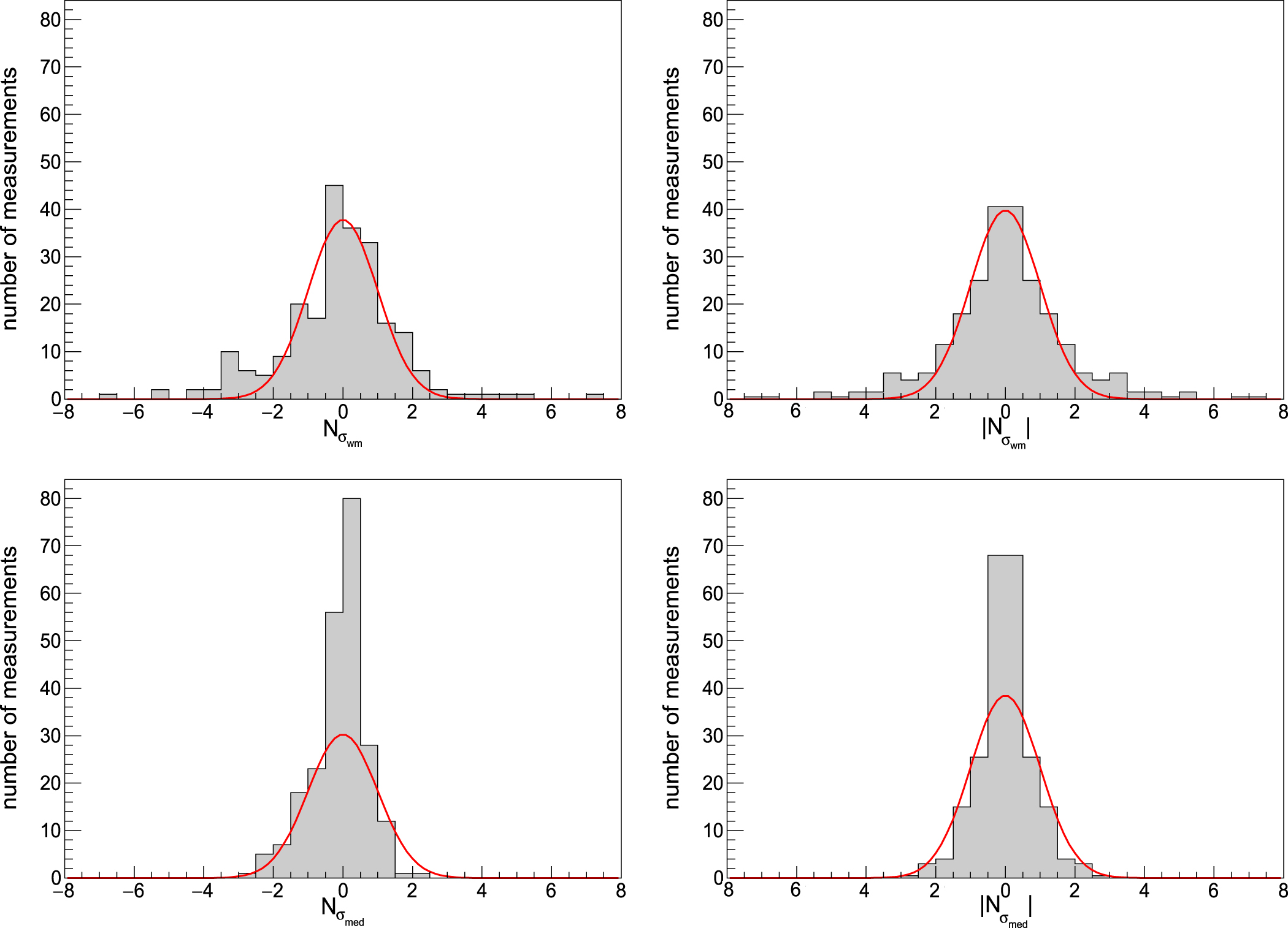 Histograms of the error distribution in half standard deviation bins. The top (bottom) row uses the weighted mean (median) of the 232 measurements as the central estimate. The left column shows the signed deviation, where positive (negative) ﹩{N}_{\sigma }﹩ represent a value that is greater (less) than the central estimate. The right column shows the absolute symmetrized distributions. The smooth curve in each panel is the best-fit Gaussian.