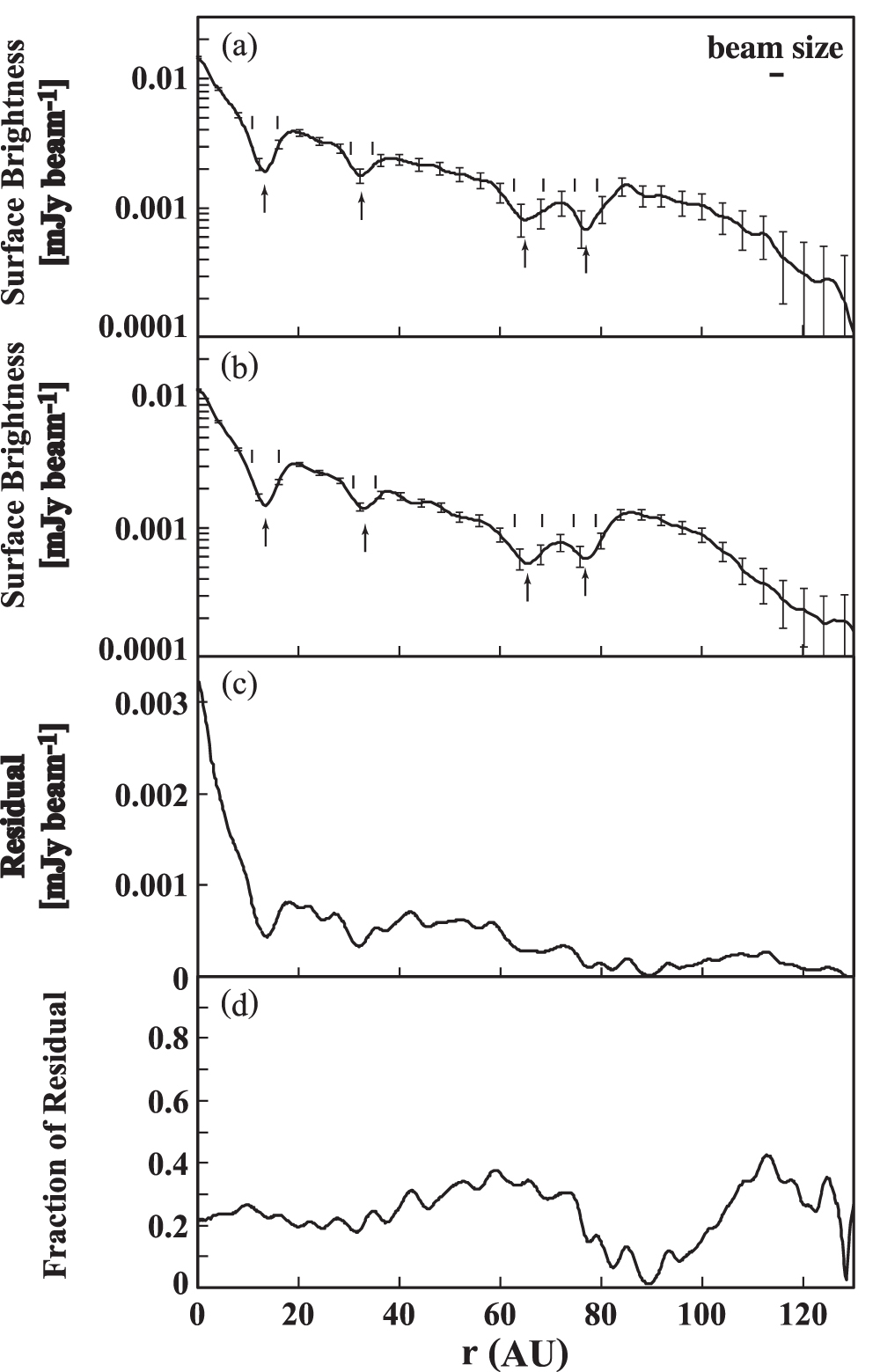 Panels (a) and (b) are the surface brightness profiles generated from our reprocessed image (Figure 2(a)) and the ALMA science verification archive data (Figure 2(b)) along the semimajor axis (PA = 138°), respectively. The error bars show 5σ. Note that the systematic error in the absolute flux determination is expected to be approximately 10% at most (see ALMA Proposers Guide and Capabilities). The beam size is shown in the upper right corner of the panel (a) as a reference. The arrows indicate the location of each gap and the pairs of the vertical solid lines describe the width at each gap. Panel (c) indicates the residual that is computed by subtracting (b) from (a), and the panel (d) represents the fraction of residuals with respect to (a).