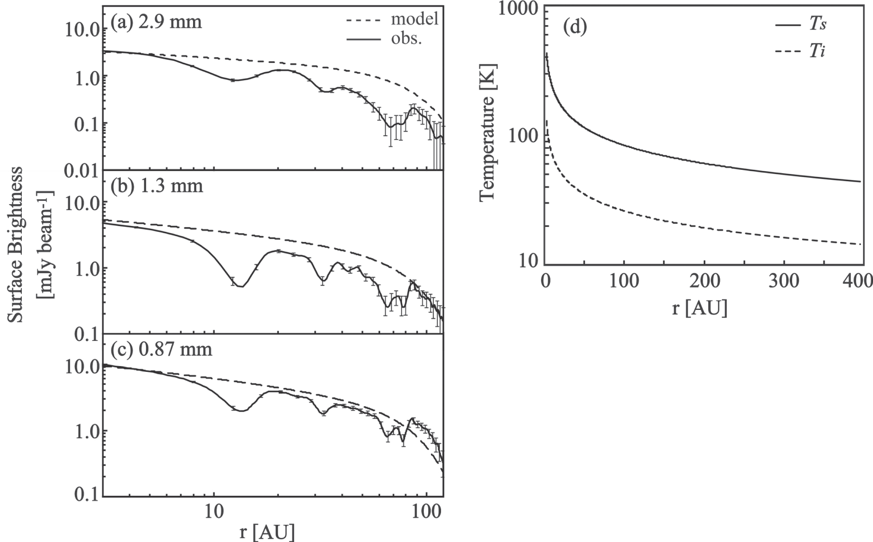 Panels (a)–(c) show surface brightness profiles (see the solid curve) at 2.9, 1.3, and 0.87 mm in wavelengths along the semimajor axis (PA = 138°), respectively. The dashed curve represents the profile generated by the Kwon et al. (2011) model. The error bar represents 5σ and the horizontal line at the lower left corner indicates the beam size at each wavelength. Panel (d) represents the radial temperature distributions at the disk surface (solid curve) and the mid-plane (dashed curve) of the disk computed from the Kwon et al. (2011) model.