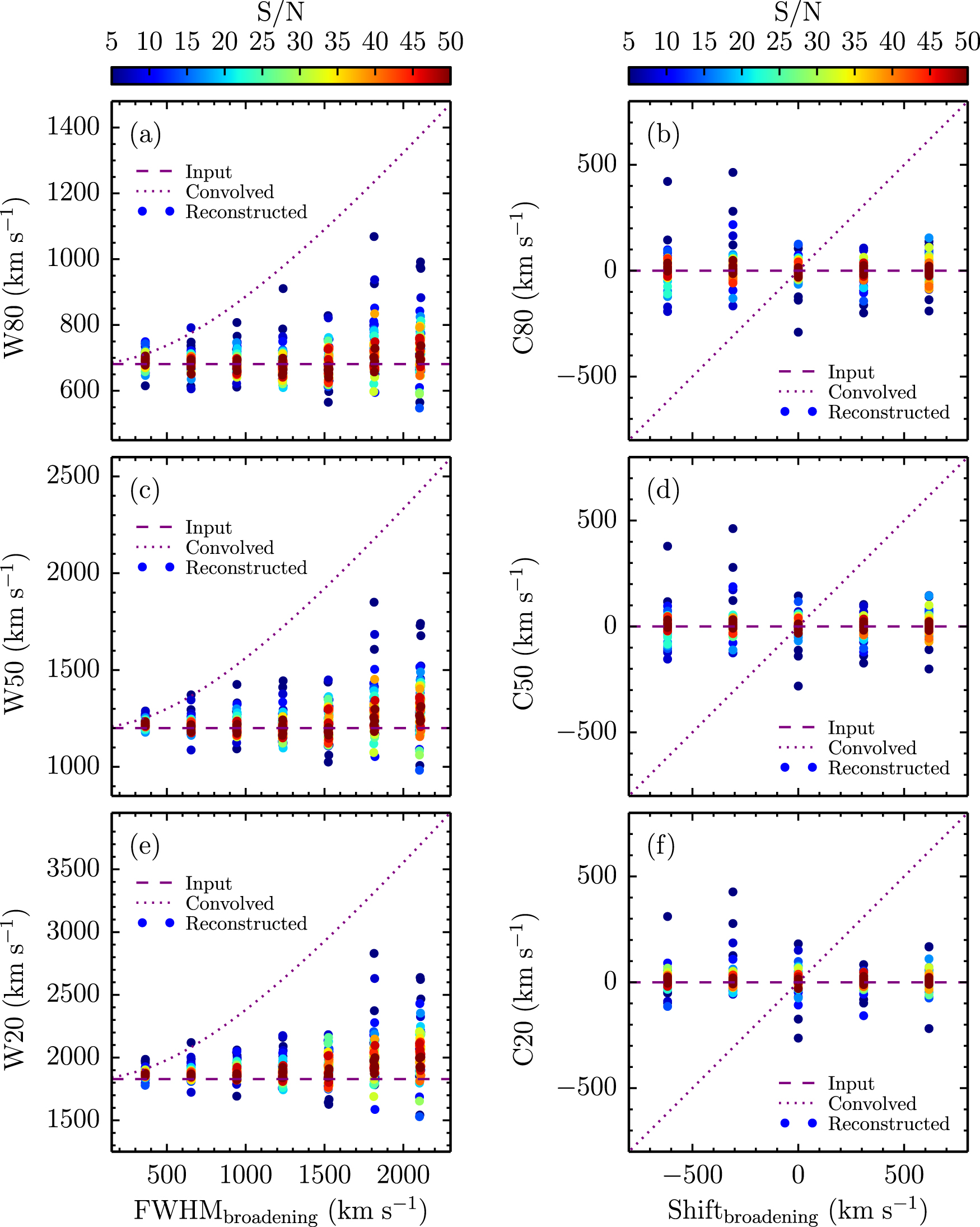 Comparisons of Hβ profiles between the input and output spectra in the Monte Carlo simulation. FWHM﹩{}_{{\rm{broadening}}}﹩ and Shift﹩{}_{{\rm{broadening}}}﹩ are the width and shift of the broadening function ξ. The dashed lines mark the values of (W20, W50, W80) and (C20, C50, C80) in the input artificial spectrum, while the dotted lines show their values in the convolved output spectra. The points are (W20, W50, W80) and (C20, C50, C80) of the profiles in the reconstructed spectra after the deconvolution. The colors show the S/Ns we set in the simulated observed spectra. The reconstruction is more successful in the cases of narrower broadening function and higher S/Ns.