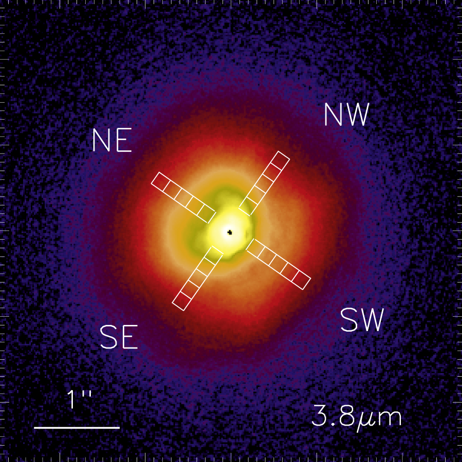 Positions of the spectra-extracted region shown in the L′ image of HD 100546 disk. 0.″162 square regions were set along the major (SE-NW) and minor (SW-NE) axes of the disk at positions of 0.″360, 0.″522, 0.″684, 0.″846, and 1.″008 from the central star.