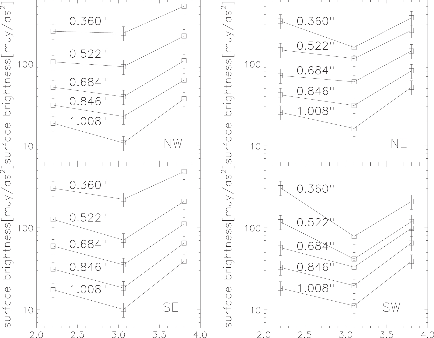 Extracted spectra along the major (SE-NW) and minor (SW-NE) axes at positions of 0.″360, 0.″522, 0.″684, 0.″846, and 1.″008 from the central star shown in Figure 2. The size of each extracted area is a square region with 0.″162 (9 pixels) on the side. In the spectra of almost all of the regions, a shallow dip at 3.06 μm is seen, likely due to water ice absorption.