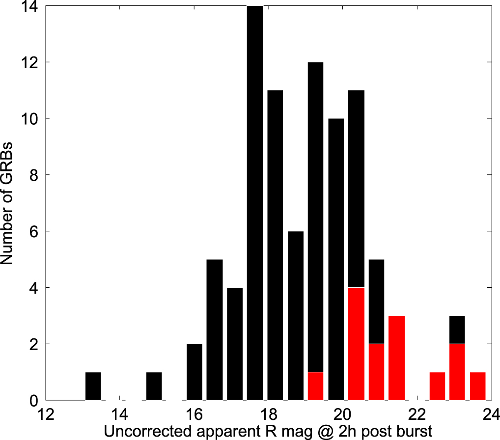 Distribution of the afterglow optical flux measured 2 hr after the burst (uncorrected R magnitude). The 76 GRBs with a redshift are shown in black and the 14 GRBs without a redshift are in red.