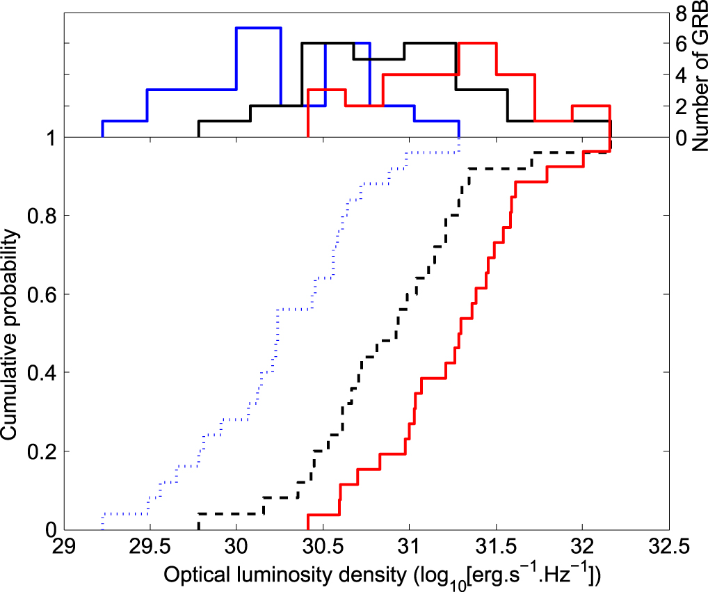 Cumulative distribution function (bottom) and histogram (top) of the optical luminosity density (taken 2 hr after the burst in the rest frame) for the three classes of GRBs. The bright, intermediate, and faint GRB afterglows are indicated by solid red, dashed black, and dotted blue lines, respectively.