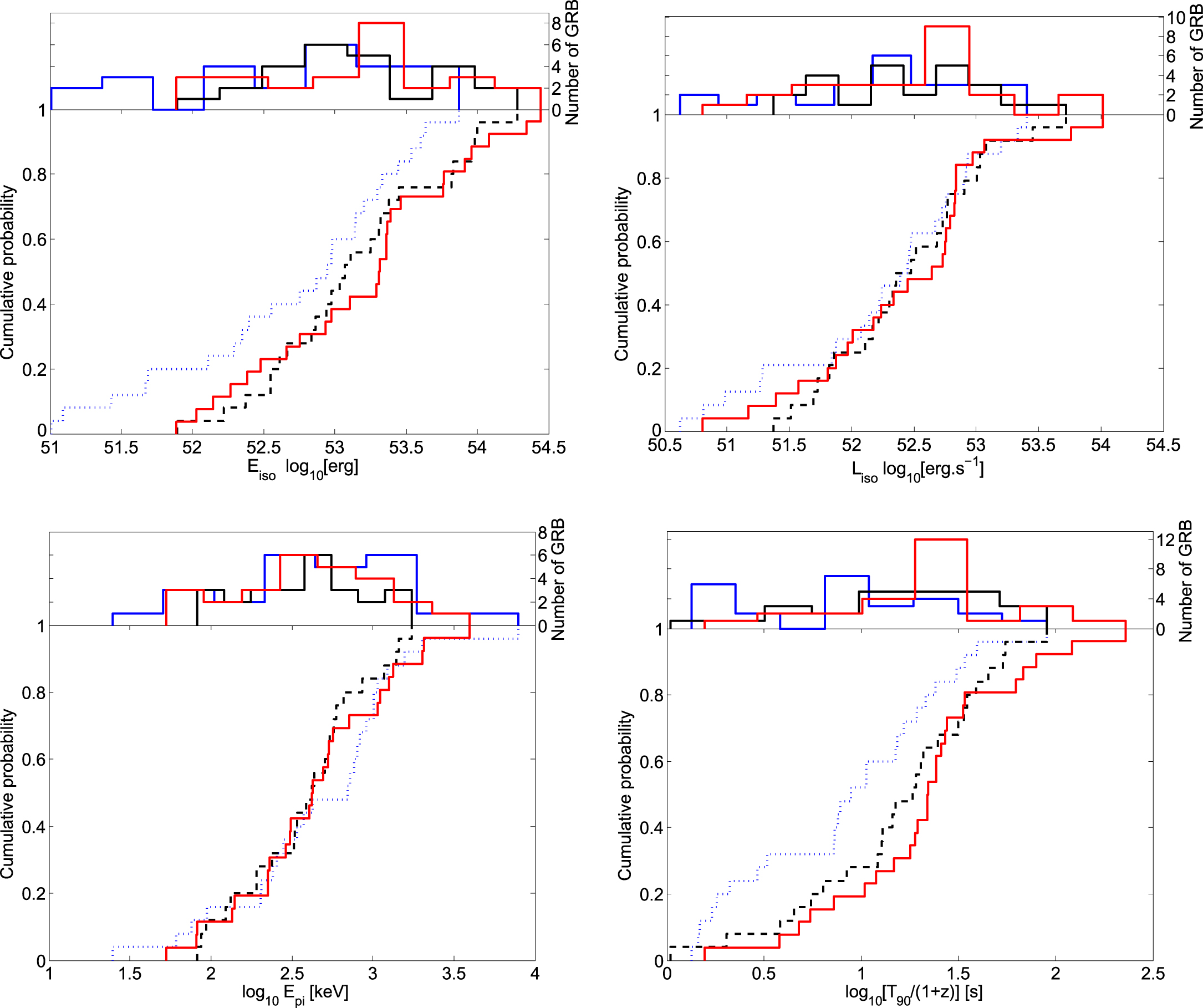 Top left: cumulative distribution function (bottom) and histograms (top) of the isotropic γ-ray energy (Eiso) for the three classes of afterglow optical flux and based on a population of 76 GRBs with a redshift. Top right: same caption for the isotropic γ-ray luminosity (Liso) based on a population of 73 GRBs with a redshift. Bottom left: same caption for the intrinsic peak energy (Epi) based on a population of 76 GRBs with a redshift. Bottom right: same caption for the rest-frame burst duration (﹩{T}_{90}^{\mathrm{rest}}﹩) based on a population of 76 GRBs with a redshift. All panels: the faint GRBs are represented with a blue dotted line, the intermediate GRBs with a black dashed line, and the bright GRBs with a red solid line.