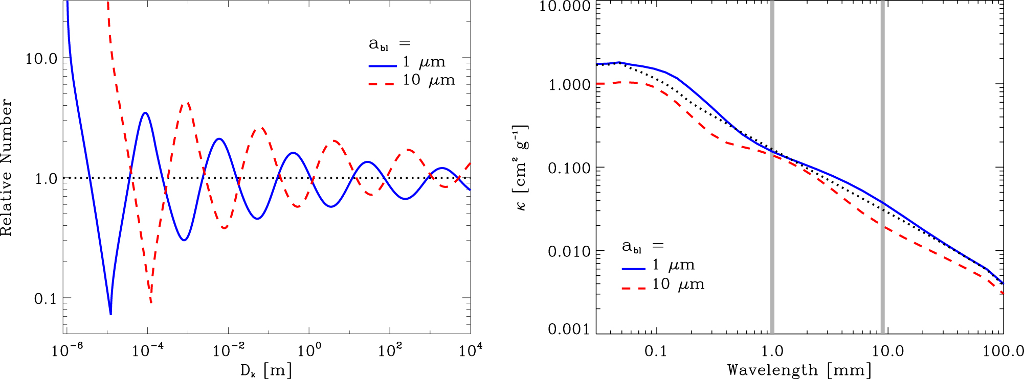 Left: comparison of the relative size distribution, ﹩n{(a)/n(a)}_{\mathrm{pl}}﹩, for a steady-state collisional cascade with a blowout size ﹩{a}_{\mathrm{bl}}﹩ of 1 μm (blue solid line) and 10 μm (red dashed line). For both models, we have divided the analytic number distribution, n(a), by the expectation for a power-law distribution, ﹩n{(a)}_{\mathrm{pl}}\propto {a}^{-3.5}﹩, to show the waves introduced by the small-size cutoff more clearly. The expected power-law size distribution, ﹩n{(a)}_{\mathrm{pl}}﹩, is indicated by the dotted black line. For all models, we assume ﹩{Q}_{D}^{*}=6\times {10}^{3}﹩ J kg−1 and ﹩{v}_{\mathrm{rel}}=5﹩ km s−1. Right: resulting ensemble opacity as a function of wavelength for a 1 μm blowout size (blue solid line) and a 10 μm blowout size (red dashed line). Again, the dotted black line indicates the expected ensemble opacity for the power-law size distribution with no waves. The gray lines indicate the wavelengths of our (sub)millimeter and VLA observations used to determine the millimeter spectral index, ﹩{\alpha }_{\mathrm{mm}}﹩.