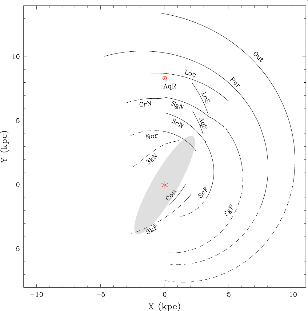 Locations and forms of spiral arm segments in the Milky Way as determined from trigonometric parallaxes of water and methanol masers (Reid et al. 2014, and references therein) associated with HMSFRs (solid lines). Dashed lines indicate extrapolations based on fits of log-periodic spiral forms to the parallax data. Arm segments are labeled as follows: Outer (Out), Perseus (Per), Local (Loc), Carina near portion (CrN), Sagittarius near and far portions (SgN, SgF), Scutum near and far portions (ScN, ScF), Norma or 4 kpc (Nor), 3 kpc near and far arms (3kN, 3kF), and Connecting (Con). Also shown are other features including the Aquila Rift (AqR), Aquila Spur (AqS), and the Local spur (LoS). The Outer Scutum–Centaurus (OSC), Carina far (CrF), an exension of Connecting (CnX), and Centaurus-Crux near and far (CtN and CtF) arm segements currently have no parallax measurements and are not plotted. The Galactic Center and Sun are indicated with a red asterisk and red Sun symbol.