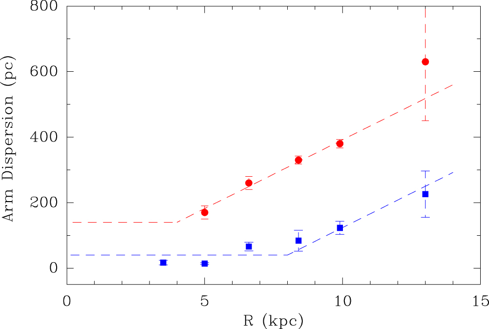 Spiral arm dispersion in width (red circles) and z-height (blue squares) vs. Galactocentric radius after Reid et al. (2014). Data from parallax sources were assigned to spiral arms and for each arm's data we calculated and plotted the standard deviation about the mean against the average radius. Dashed lines indicate broken linear fits, that were used to determine the expected deviations of sources from the model spiral arm segments.