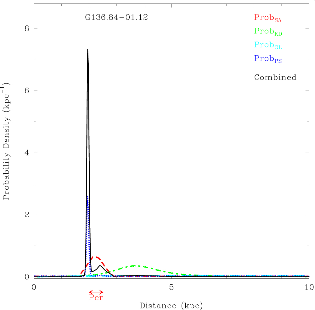 Distance PDF for G136.84+01.12, a 6.7 GHz methanol maser at ﹩v=-45﹩ km s−1 from the Pestalozzi et al. (2005) catalog. The (l, b, v)src values associate it with the Perseus spiral arm centered near 2.4 kpc (red dashed line). This information, coupled with association with the parallax source G133.95+01.05 (blue dotted line), favors the distance estimate of 1.96 ± 0.04 kpc over the arm center. Note that the kinematic distance (green dotted–dashed line) suggests a much greater distance of 3.7 kpc, as it does for many sources in this part of the Perseus arm which is known to be kinematically anomalous.