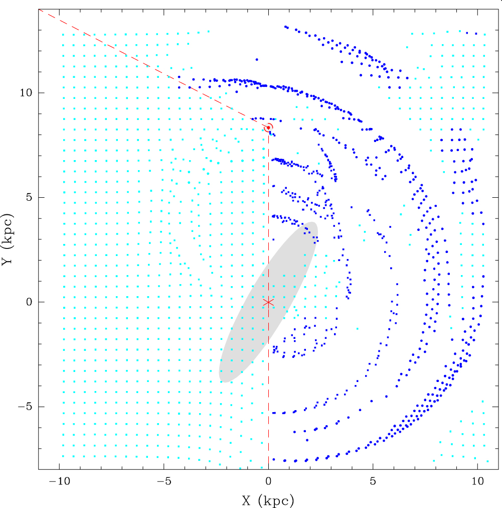 Test of the influence of including the spiral arm contribution to the combined distance PDF. We generated fake sources on a uniform grid with pure circular rotation. For sources to the left and below of the red dashed lines, where no spiral arm information is used, the program returns the input locations with reasonable accuracy (except for slight deviations in regions near ﹩{\ell }\approx 0﹩ and near the “tangent points” where small velocity changes result in large changes in distance). However, to the right and above the red dashed lines, spiral arm information was used, resulting in distance estimates biased to spiral arms.